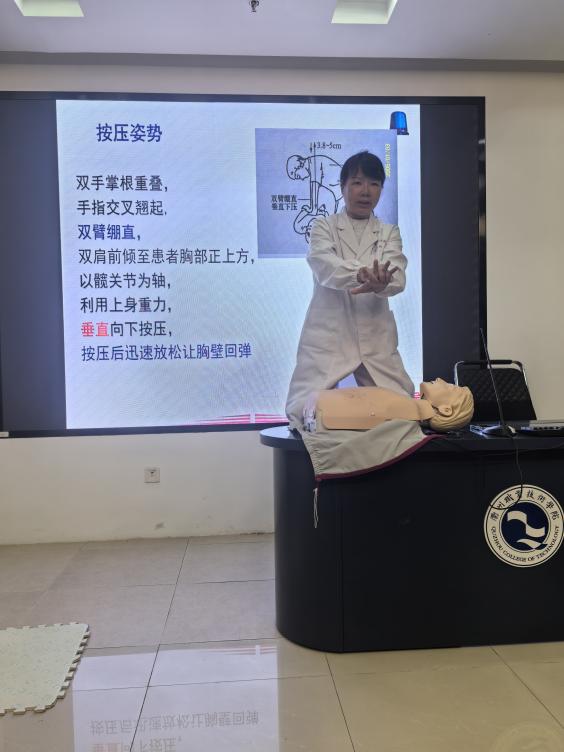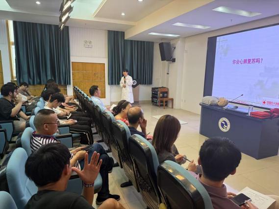 培训现场,吴秀仙老师以暑期常见突发场景为切入点,系统梳理了溺水、中暑、异物卡喉等安全风险的预防要点,着重强调“预防为先、科学施救”的安全理念。围绕心肺复苏(CPR)与自动体外除颤器(AED)的使用、海姆立克急救法三大核心技能,她通过“理论讲解+场景演示”的方式展开教学。
