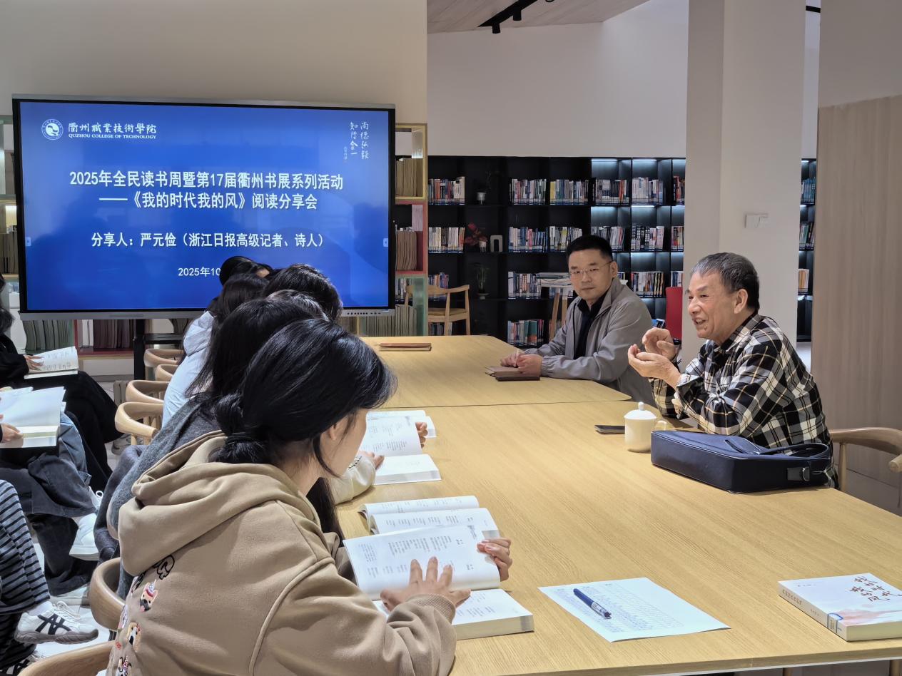 在2025年全民读书周暨第17届衢州书展的浓厚氛围中,10月24日,衢州职业技术学院图书馆特邀浙江日报高级记者、诗人严元俭,以其长篇“诗自传”《我的时代我的风》为载体,为师生带来一场兼具文学厚度与时代温度的阅读分享会,现场氛围热烈而动人。